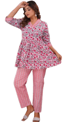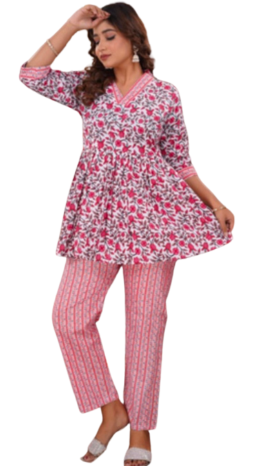 Jaipuri Cambric Cotton Printed Umbrella-Style Short Kurti with Pocket Pant